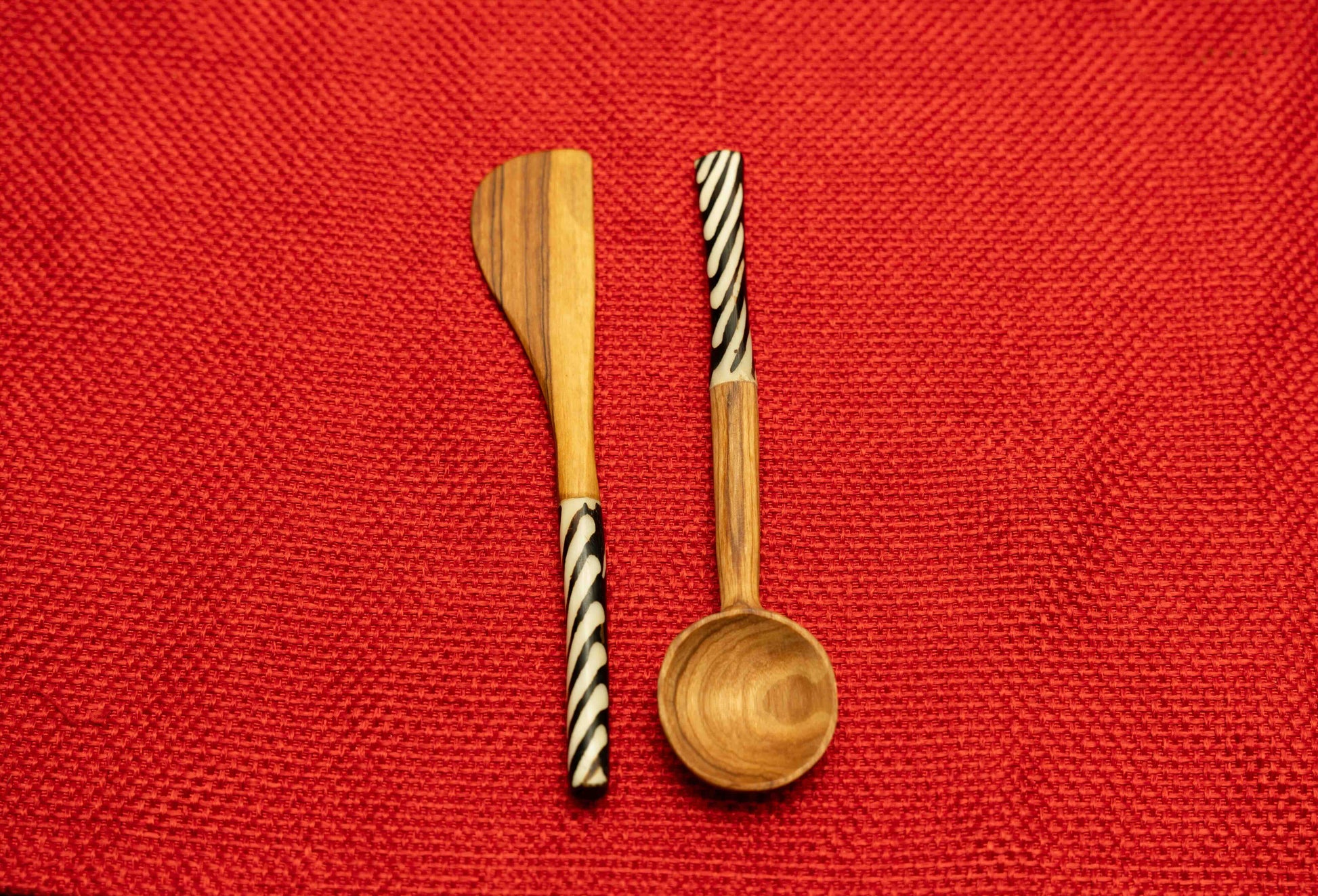 Add a touch of artisan charm to your table with this compact wooden spoon and fork set, beautifully handcrafted in East Africa. Each piece is carved from locally sourced hardwood and finished with a smooth, polished bone inlay at the handle — accented with hand-etched detailing for a unique, elegant look.