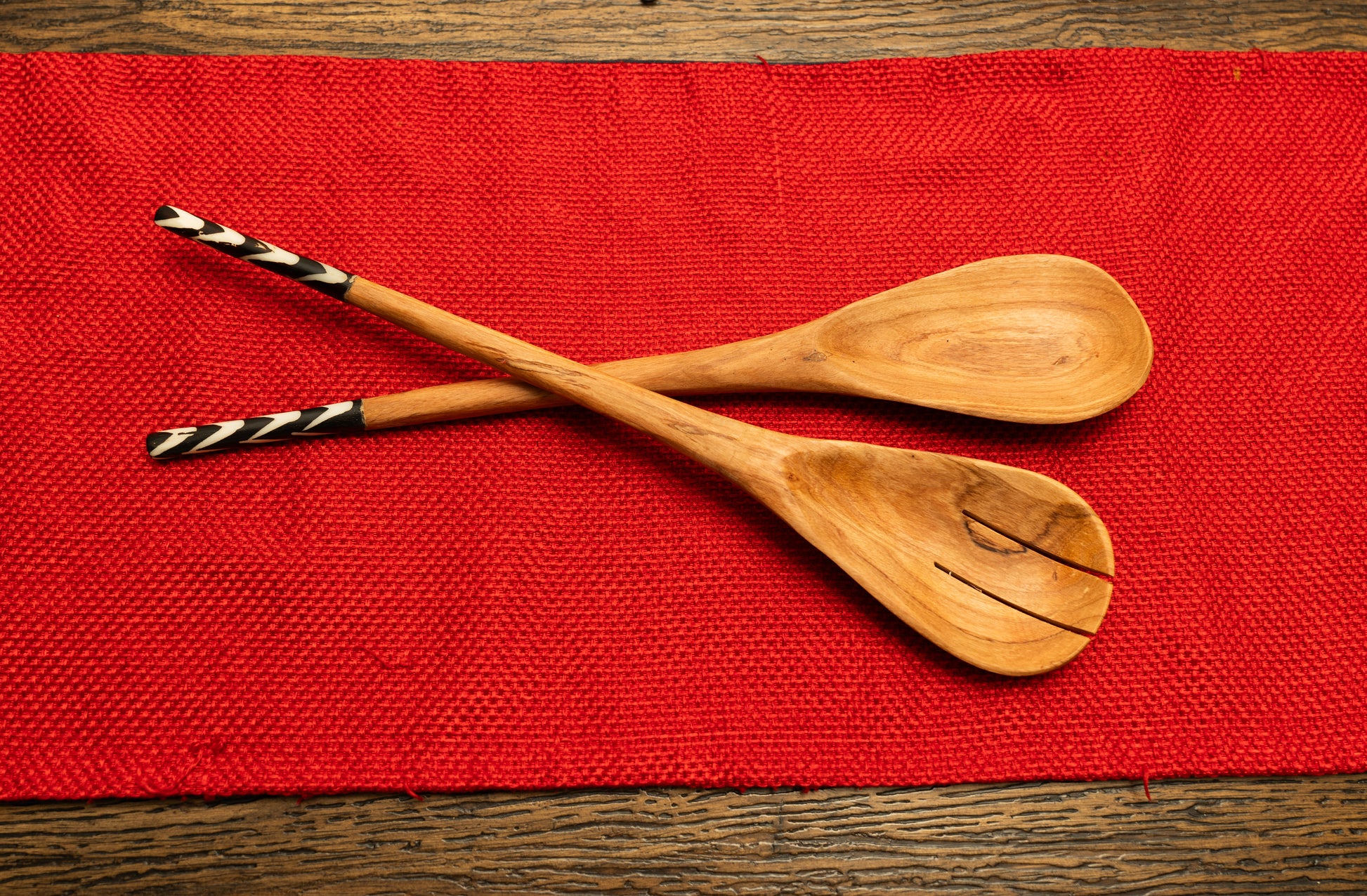 Elevate your dining experience with these beautifully handcrafted wooden salad spoons, skillfully made by Kenyan artisans. Ideal for tossing and serving salads, pasta, or side dishes, these spoons bring a touch of African artistry to your kitchen.
