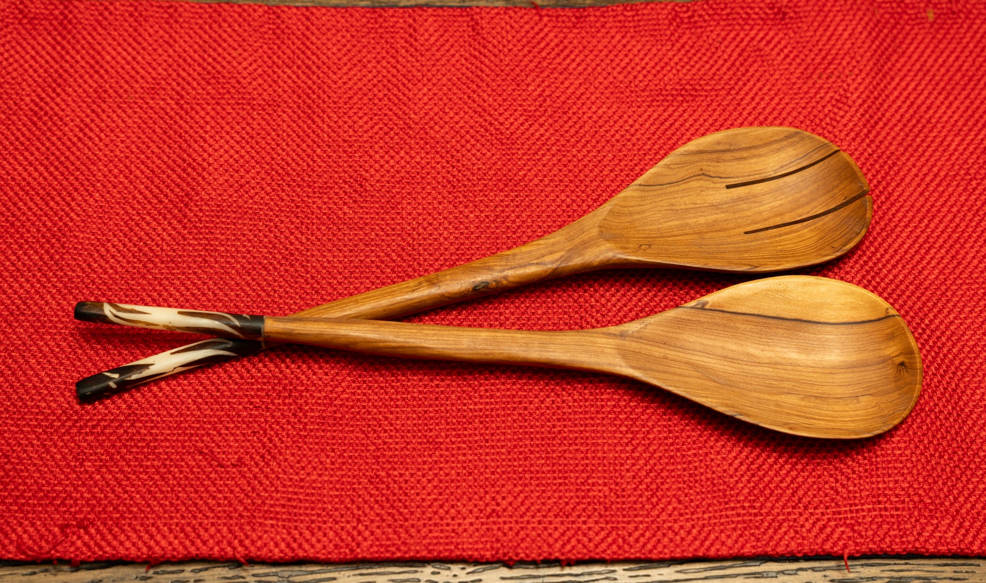 These wooden spoons feature a hand-carved, tapered handle ending in a unique flame-inspired motif. The black and natural tones are carefully inlaid or painted to evoke the shape of rising flames or a stylized feather — offering both visual flair and a comfortable grip. A beautiful blend of function and artistry.